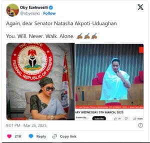 Natasha, who is currently facing a recall process initiated by some of her constituents, took to X to commend Ezekwesili.